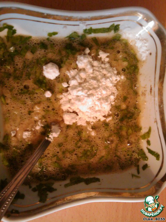 слегка взбиваем яйцо, добавляем в него соль, перец, мелко порезанную зелень и крахмал