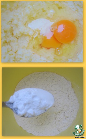 Потом надо было взбить миксером масло (комнатной температуры) с сахаром до "пушистости" и добавить к ним яйца. Взбить как следует еще раз. В другой миске смешать муку с солью и разрыхлителем. Добавить мучную смесь к яично-масляной, взбивать несколько минут до однородности.