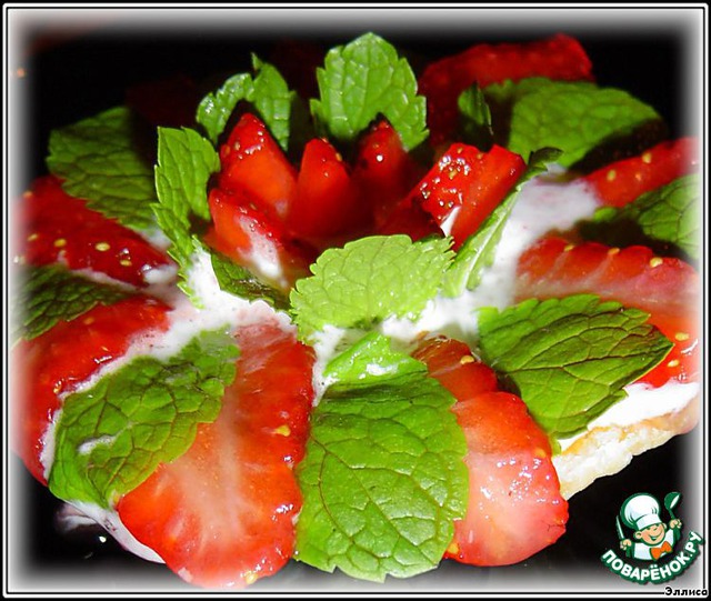 Нарезаем клубнику вдоль и укладываем ее сверху крема, чередуя с листьями мяты.