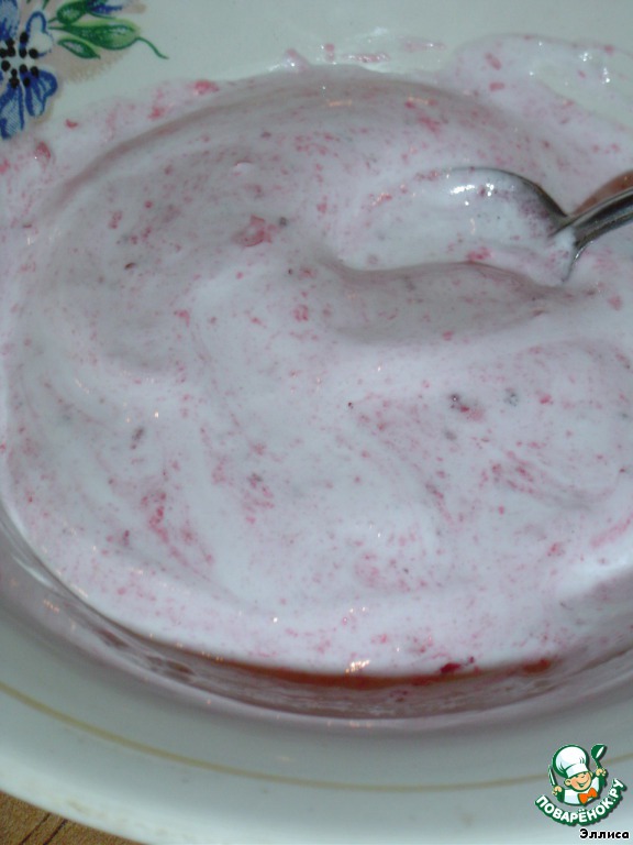 Взбиваем охлажденные белки с сахаром до устойчивых пиков. К белкам добавляем растертую с сахаром клюкву