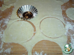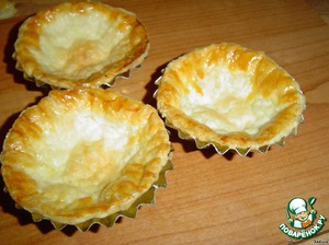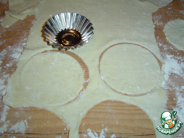 Раскатываем готовое слоеное тесто, вырезаем стаканом кружочки и распределяем их по формам, смазанным маслом.
