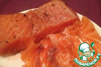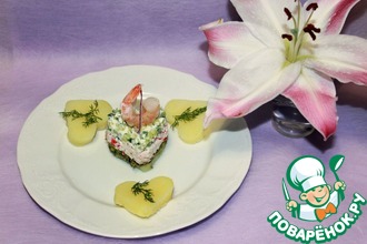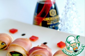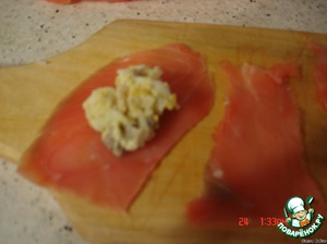 Порезать кусочками рыбку, по 1 чайной ложке уложить приготовленный салат и завернуть.