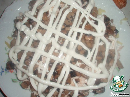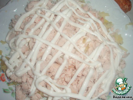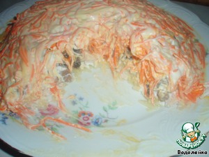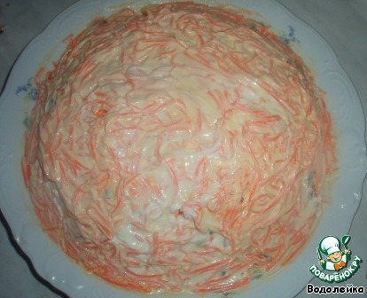4-морковка по-корейски. Верх так же смазать майонезом. Дать салату постоять пару часов для пропитки.