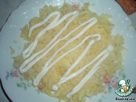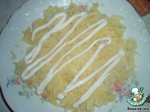 1-картофель, потертый на терку (немного посолить и поперчить) + майонез. -