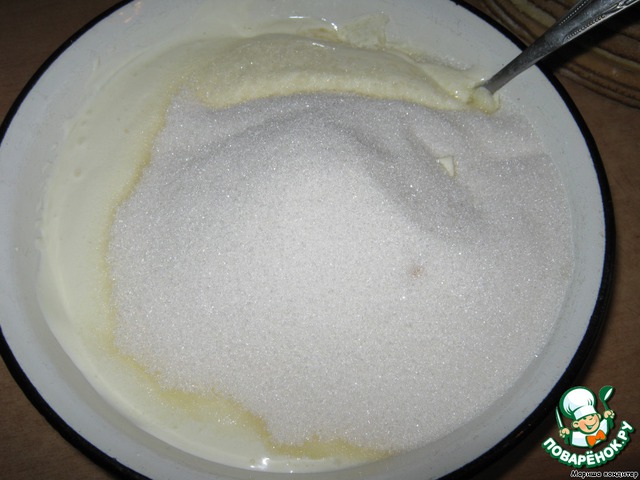 Готовим крем. Сметану с сахаром взбиваем до тех пор, пока сахар не растворится, не используйте миксер!!! Крем будет от этого только жидким, лучше - ложкой вручную, это не долгий процесс