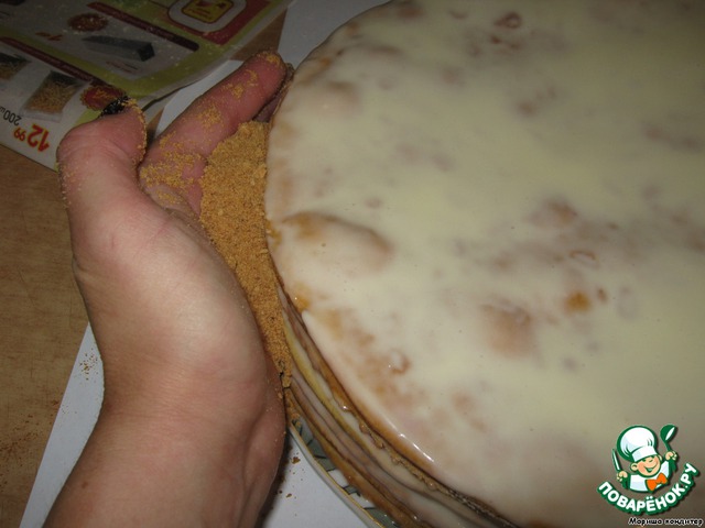 в полученную крошку добавляем измельченный и прокаленный на сковороде грецкий орех и посыпаем крошкой сначала бока, а затем и верх нашего тортика.