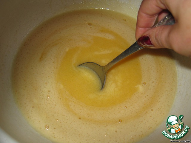 Отдельно растираем яйца с сахаром, аккуратно добавляем в мед и маргарин яично-сахарную смесь, не снимая с водяной бани, соду (не гасить!). Непрерывно помешиваем