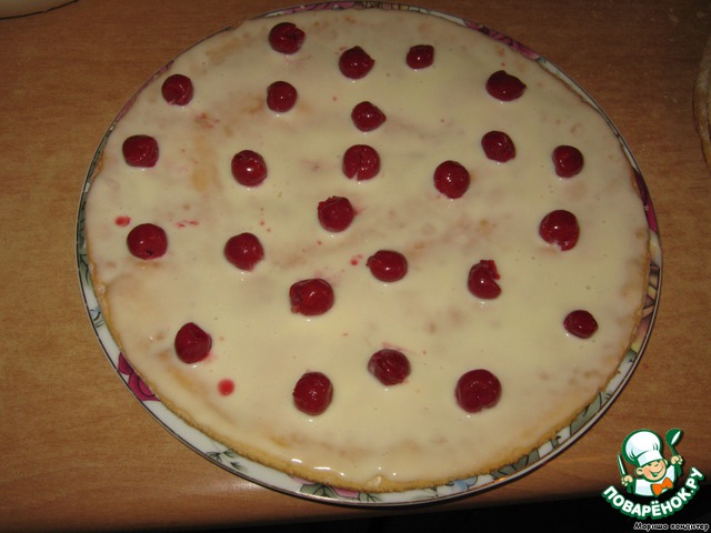 Каждый корж обильненько смазать кремом (не жалейте, крема хватит))) и посыпаем консервированной вишней без косточек