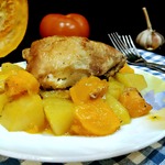 В рукав укладываем слоями: картофель, тыква, куриные бедра.