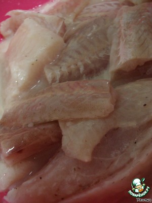 Филе рыбы моем, режем на кусочки и заливаем соком из 2 лимонов, солим, перчим.