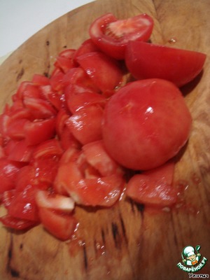 Моем, надрезаем крест накрест помидоры, ошпариваем и снимаем с них кожицу. Нарезаем кубиками. Крупно.