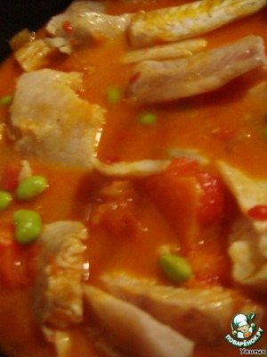 Следом за карри высыпаем сою и выкладываем рыбу. Я всегда еще чуть-чуть добавляю лимонного сока, в котором настаивалась рыба. Мне нравится потом эта кислинка в блюде. Накрываем крышкой.