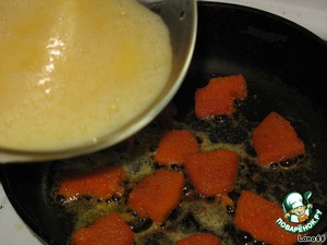 Вылить на обжаренные кусочки тыквы. Для пикантности в яйца можно выдавить зубчик чеснока.