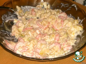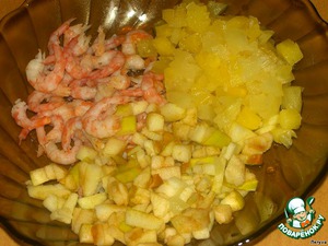 Перемешиваем креветки, нарезанные ананасы и яблоко. Заправляем майонезом.
