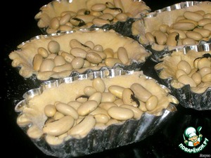 Достаём из холодильника тесто. Наполняем формочки тестом, а сверху насыпаем сухую фасоль (чтобы в центре тесто не поднялось).