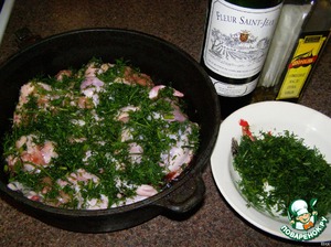 Итак, вынимаем кости и на их место запихиваем каштаны, сколько влезет, но не сильно плотно. Далее, солим, смазываем форму маслом, выкладываем крылышки, засыпаем зеленью, поливаем немного маслом (у меня чуток оливкового осталось) и сухим вином и отправляем в духовку примерно на часик. Все. Теперь можно вынимать и наслаждаться необычным сочетанием куриного мяска и сладковатых крахмалистых каштанов.
