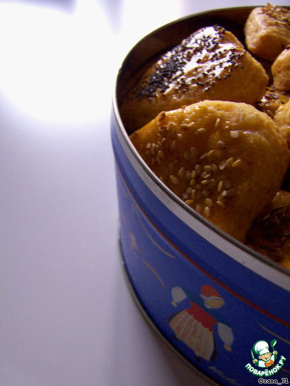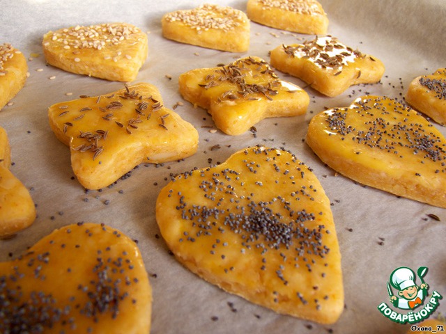 Выложить на противень, покрытый пекарской бумагой, и поставить в холодильник на 30 минут. Затем, желток взбиваем и смазываем печенья ( лучше не все сразу, а по нескольку, так как засыхает быстро ). Сверху посыпать семенами кунжута, семенами мака и кумином.