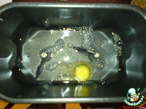 Положить все ингредиенты,кроме маслин и перца, в форму, в порядке, указанном в инструкции к Вашей хлебопечке. Я опишу свои шаги, итак, в форму для выпечки наливаем воду + вбиваем туда сырое яйцо = 400мл