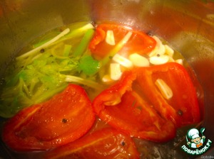 Промыть и очистить от семян перцы, чеснок - на дольки,сельдерей - на небольшие кусочки.