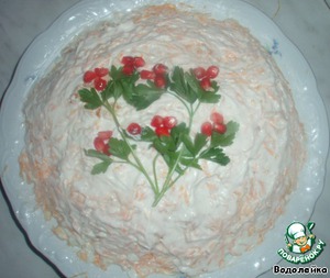 Сыр сверху промазать также майонезом и украсить по желанию. Дать немного постоять.