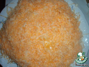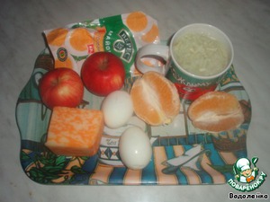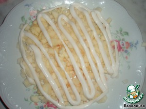 1 слой - порезанные мелко яблоки (естественно, предварительно их почистить от шкурки и семян) + майонез.
