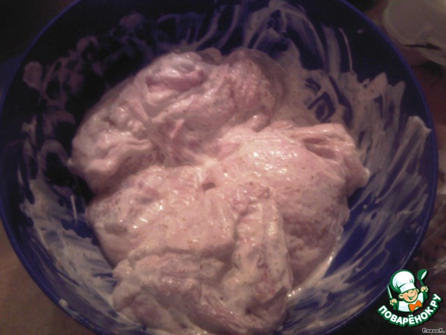 • Куриные бедра солим, перчим, добавляем любимые приправы, обмазываем майонезом и оставляем мариноваться.
