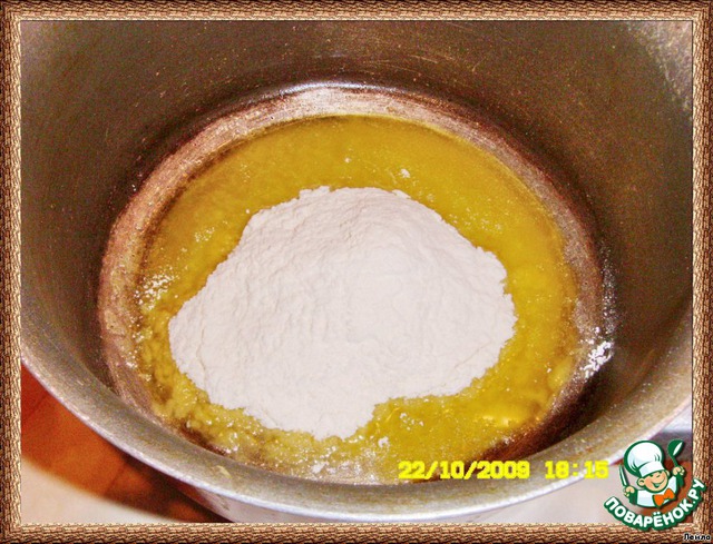 В кастрюле с толстым дном растопить масло и добавить муку (огонь под кастрюлей должен быть минимальным или можно в это время кастрюлю с огня снять)