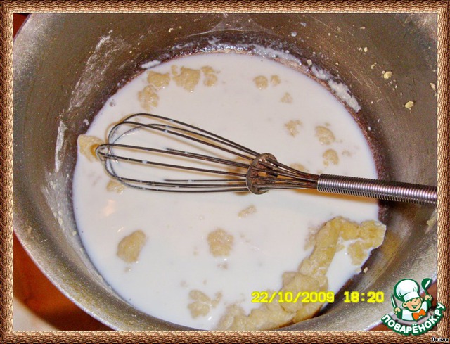 Добавляем 1/2 стак. молока и размешиваем венчиком, пока не получится однородная масса (кастрюля на плите - огонь маленький),