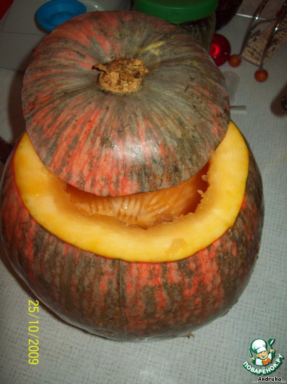 Накрыть тыкву "шапкой", пришпилить ее зубочистками. Поместить тыкву в духовку. Выпекать при температуре 150-180 гр гре-то 60-90 мин. Время зависит от размера тыквы.