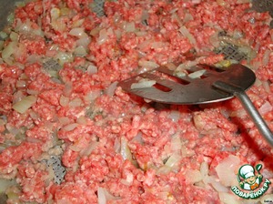 Лук репчатый очистить, порезать мелкими кубиками, обжарить, добавить фарш, кориандр, 2 столовые ложки томатной пасты, добавить по вкусу соль и черный перец. Все перемешать, тушить в течение 30-40 минут на медленном огне. В конце тушения добавить 3 измельчённого зубчика чеснока. -