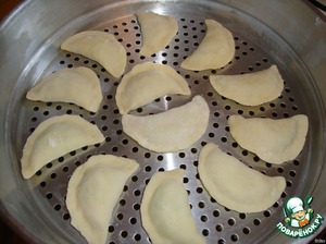 Из полученного теста скатать жгут, разрезать его на куски, каждый кусочек раскатать скалкой на присыпанной мукой доске в тонкий пласт. Специальной выемкой (тонким стаканом или рюмкой) вырезать кружочки. Обрезки теста скатать в ком, слегка вымесив снова раскатать. На кружок теста, в самый центр, положить немного начинки. Согнуть кружок с начинкой пополам и тщательно защипнуть края. Затем каждый лоток пароварки смазать маслом и разложить ашак. В пароварке уже должна быть кипящая вода, готовить в течение 20-25 минут.