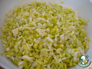 Лук-порей (только белая часть) разрезать пополам по длине и хорошо промыть. Срезать с луковиц корни, вытереть их и просушить. Положить ровным слоем на разделочную доску, порезать луковицы на кубики. Затем добавить 3 столовые ложки растительного масла, чайную ложку соли, месить руками до размягчения. -