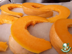Чистим от семян (оставляя кожуру) и режем на дольки тыкву. На противень, закрытый пекарской бумагой, выкладываем дольки тыквы и запекаем в разогретой духовке 50-60 минут при темп. 180°.
