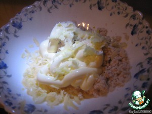 • добавляем натертый на терке сыр, чеснок, майонез и перемешиваем.