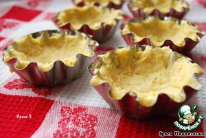 Разогреть духовку до 200 гр. Формочки для тарталеток смазать маслом, выложить тесто толщиной 2-3 мм. Честно говоря, рецепт теста брала из "Школы Гастронома", там рекомендуется выпекать 10 минут и потом охладить, накрыв полотенцем. Во время выпечки тесто вело себя несколько странно, масло шипело, поэтому время я увеличила до 20 минут. *SCRATCH*