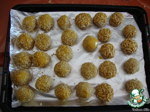 затем налепить из теста шарики размером 4 см, обмакнуть во взбитое яйцо и обвалять часть из них в кедровых орешках и часть в миндале, обмазать сверху желтком и поставить в разогретую духовку (180 градусов)на 10-15 минут