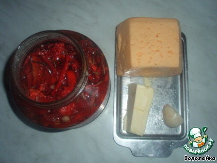 Так же поступаем со вторым куском теста(т.е раскатываем) и накрываем первый слой (сырный).Так же смазать маслом с чесноком и сверху выложить вяленые помидоры. Помидорчиков кладите побольше, будет вкуснее.