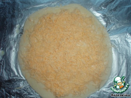 Берем противень, застилаем его пекарской бумагой и смазываем маслом ( у меня бумага закончилась, поэтому я взяла фольгу). Берем 1 кусок теста раскатываем и придаем ему форму круга. выкладываем на противень, сверху смазать сливочным маслом с чесноком и сверху выложить половину нашего натертого сыра.