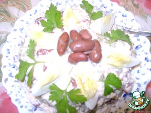 Курочку и виноград мелко режем, сыр трём на крупной тёрке, добавляем промытую фасоль, всё перемешиваем и заправляем: