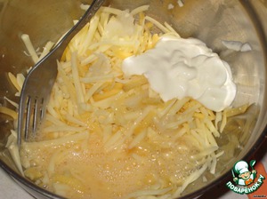 В натертый сыр добавить яйцо, сметану, порубленную зелень, паприку, куркуму, смесь перцев, перемешать.