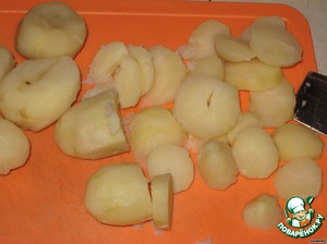 Были жареные опята с луком - примерно 150-200 г, 10 маленьких клубней картофеля. Дальше натерла сыр сулугуни и моцареллу, в общем, примерно 100-120 г.