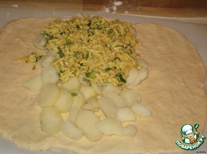 Тесто зрительно поделить пополам, на одну половину выложить картошку, сверху сырную массу.