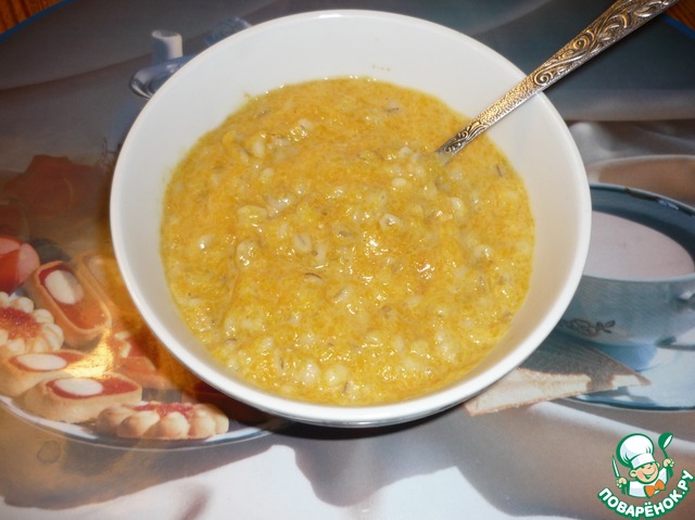 - параллельно кипятим молоко, засыпаем туда перловку, размешиваем и провариваем минутку-другую;