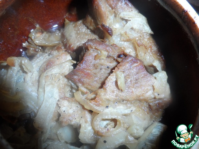 Здесь я позволила себе сделать второе отступление от рецепта. Почему-то идея с тушением мяса мне не очень приглянулась, и я решила запечь его в духовке. В горшочках, которые пылились на полке, и не были еще опробованы в работе.