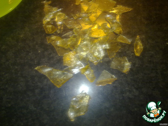 Для карамели сварить сироп из воды, сахара и глюкозы. Когда она будет готова, выложить её на слегка промасленный противень и оставить остывать.