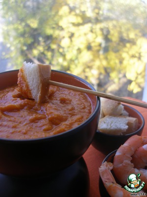 Нарезать багет небольшими кубиками. Подготовить креветки или любые другие продукты (небольшого размера, но которые удобно нанизывать на шпажки или деревянные палочки). Перелить тыквенное фондю в горячую керамическую миску (в идеале - в кокелон - керамическую миску с горелкой или свечой внизу) и есть немедленно, макая в тыквенное фондю кусочки хрустящего багета (и запивая белым вином..., и рядом с любимым...)! Да здравствует осень!