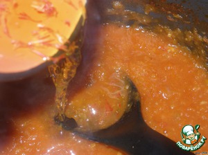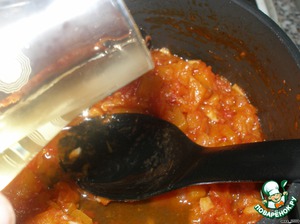 Очищенные помидоры также мелко нарезать, удалив семена. Отправить помидоры в кастрюлю. Добавить кетчуп и немного вина. Варить под крышкой на медленном огне 20-30 минут, иногда помешивая.