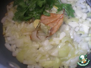 В кастрюле или сотейнике с толстым дном разогреть оливковое масло. Репчатый лук и лук порей мелко нарезать и отправить в масло. До золотистого цвета не доводить! Лук должен стать только прозрачным. К луку добавить порезанный чеснок, петрушку, розмарин и сельдерей (целыми веточками), лавровый лист и кориандр. Тушить на медленном огне, помешивая, 10-15 минут.
