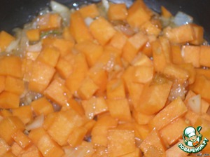 Тыкву нарезать на мелкие кубики и отправить к луку. Помидоры очистить от тонкой кожуры (опустив на пару минут в кипяток).