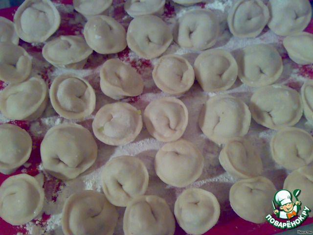 Раскатать тесто не очень тонко, вырезать рюмочкой из теста кружочки. В кружочки уложить начинку, вылепить пельмень! =)